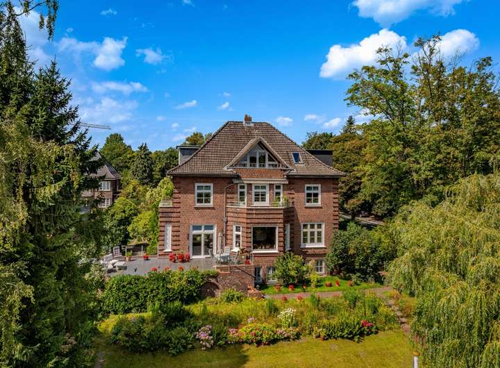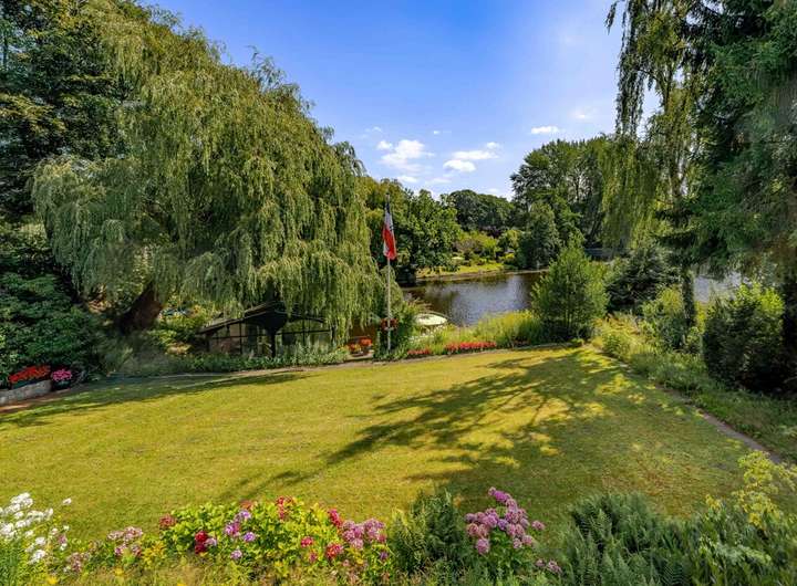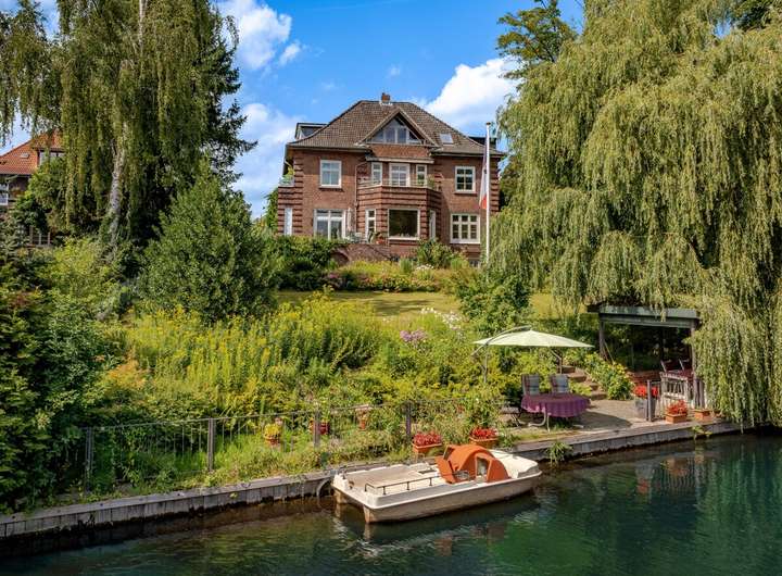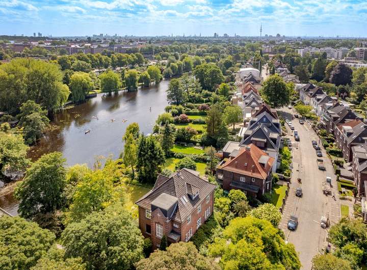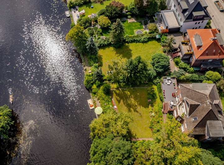 Diese außergewöhnliche Villa befindet sich auf einem Grundstück mit einer Größe von 1.184 m² und besticht durch einen direkten Zugang zum Alsterlauf mit Bootsanleger.