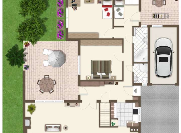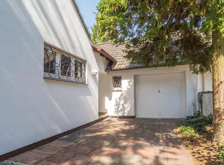Das Haus steht mittig auf dem Grundstück. Sie laufen die lange Einfahrt entlang, die genug Platz für Ihre Autos bietet. Am Ende befindet sich die Garage und der Eingang zum Haus.