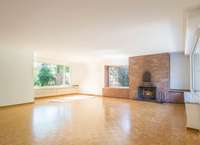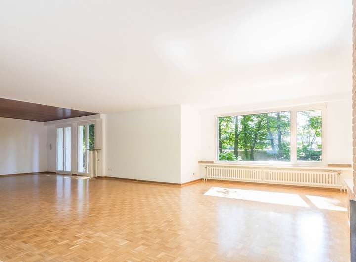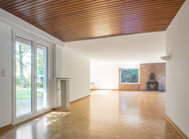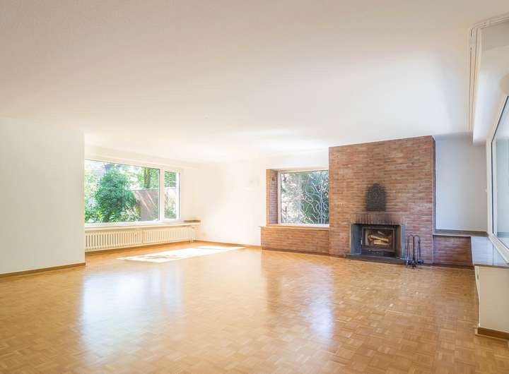 Ca. 65 m² Wohnbereich! Einiges an Platz für Ihre Möbel. Der große Esstisch, der allen Ihren Gästen Platz bietet, wird hier genauso gut zur Geltung kommen, wie die gemütliche Sofagarnitur, die Sie sicher um den Kamin drapieren werden. Hier können Sie beim Knistern des Feuers sich in ein gutes Buch vertiefen. Die vielen Fenster sind teils raumhoch und geben dem Blick in die beiden Gärten frei, der Blick ins Grüne ist somit ganzjährig möglich.