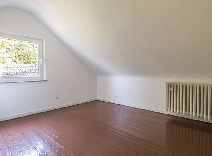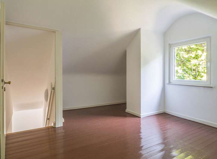 Neben der Küche geht die Treppe hoch in Ihren „Bonusraum“ unter dem Dach. Ein Räumchen mit Atmosphäre. Der Holzdielenboden knarckst unter Ihren Füßen und durch das Fenster schauen Sie direkt in die Baumwipfel.