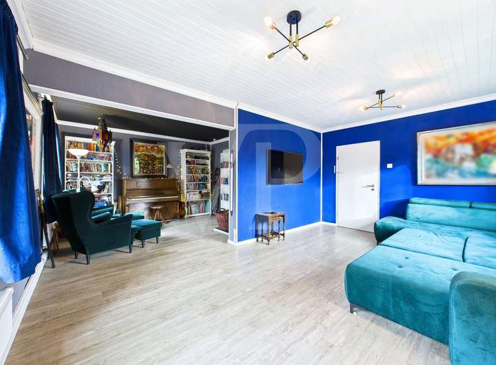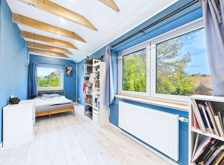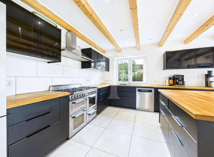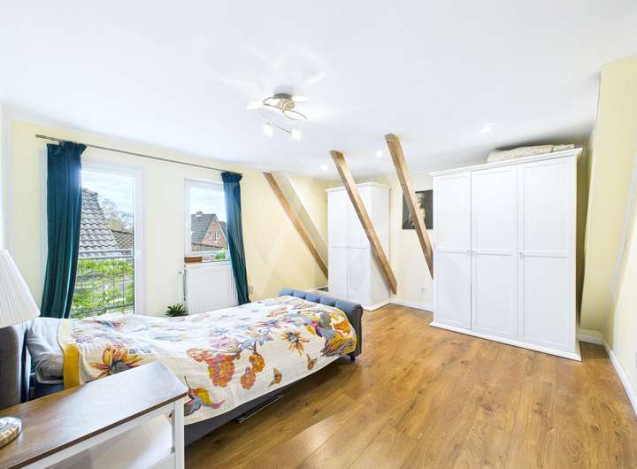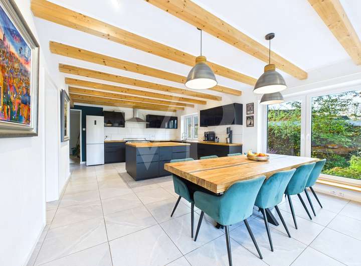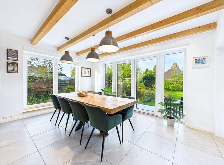 Die Raumaufteilung überzeugt mit insgesamt sechs Zimmern, darunter vier Schlafzimmer, die vielfältige Nutzungsmöglichkeiten eröffnen. Der großzügige, lichtdurchflutete Wohn- und Essbereich bildet den Mittelpunkt des Hauses und verbindet Offenheit mit einem hohen Wohlfühlfaktor. Das separate Wohnzimmer fügt sich harmonisch ins Gesamtbild ein und bietet mit seinem Kamin einen gemütlichen Rückzugsort. Vom Wohn- und Essbereich aus gelangen Sie direkt auf die große Terrasse, die einen schönen Blick in den gepflegten Garten eröffnet und den Wohnraum nach draußen erweitert.