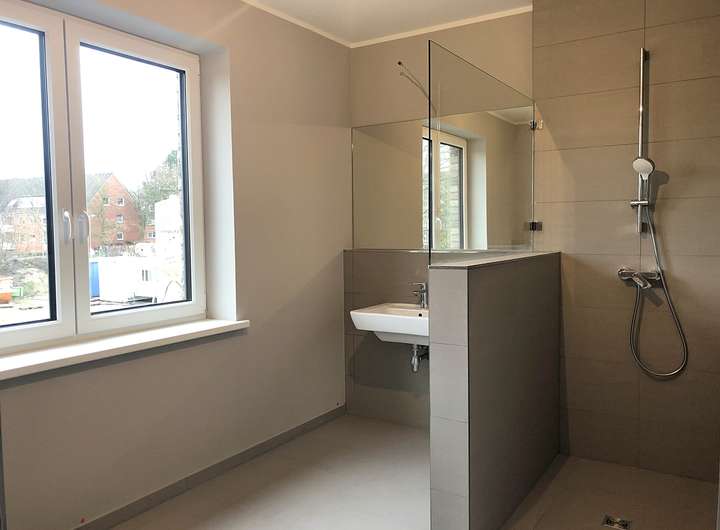 - Großformatige Feinsteinzeug-Fliesen in den übrigen Bereichen