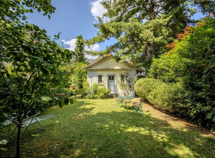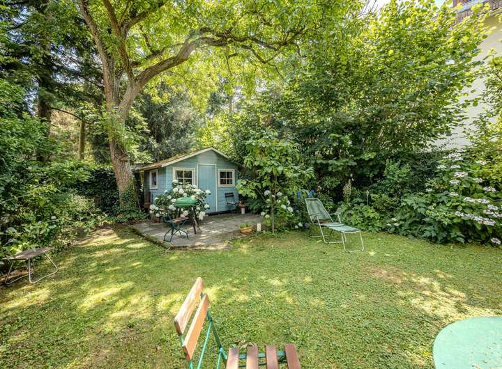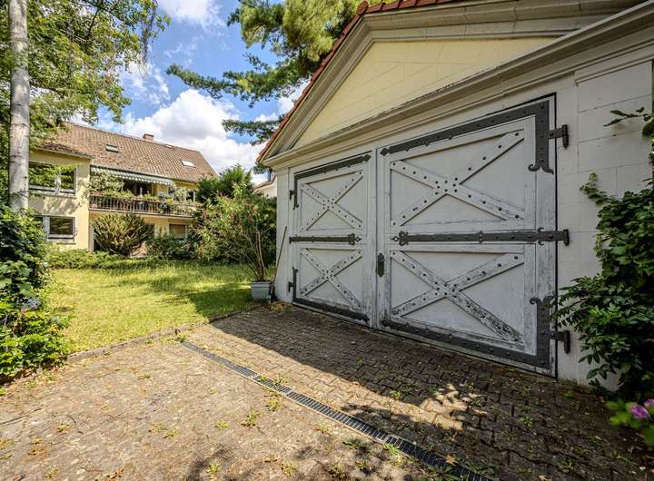 Im Außenbereich befinden sich der großzügige, kaum einsehbare Gartenbereich mit Gartenhaus und das Garagengebäude, welches mit knapp 50 m² Nutzfläche Platz für bis zu 2 PKWs bietet.