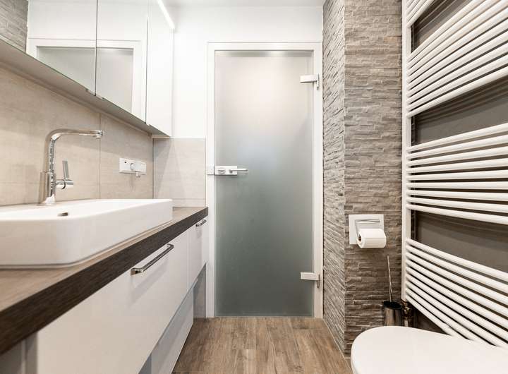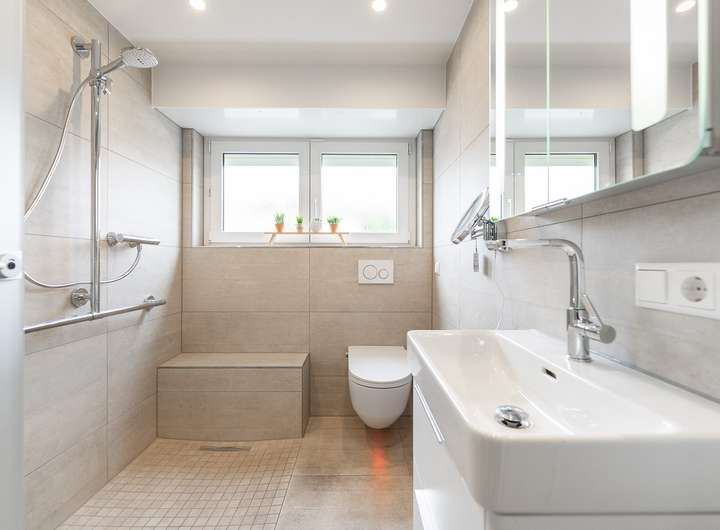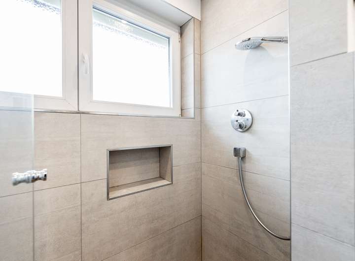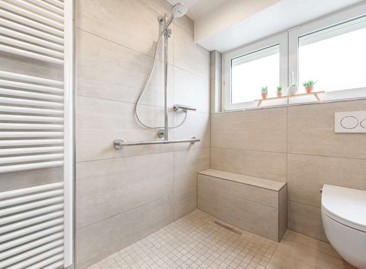 Das modern sanierte Badezimmer präsentiert sich in zeitgemäßem Design mit bodengleicher Dusche und hochwertigen Armaturen.
