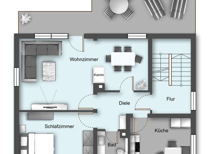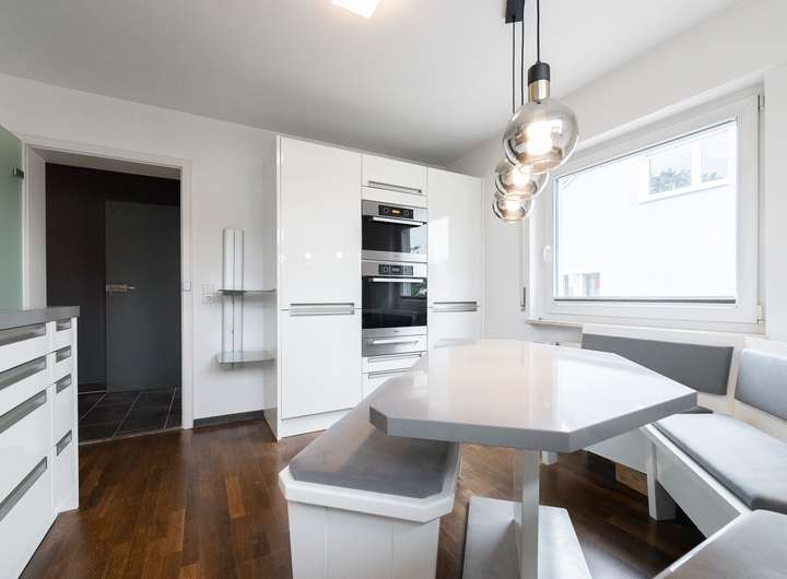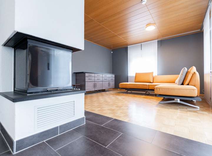 Ein besonderes Highlight ist der Design-Kamin zwischen Wohn- und Essbereich, der für ein stilvolles Ambiente sorgt. Sowohl der sonnige Balkon als auch die überdachte Terrasse laden zum Verweilen und Entspannen ein.