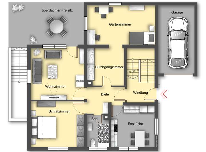 Die überdachten Terrassen mit elektrischer Verschattung schaffen geschützte Rückzugsorte und erweitern den Wohnraum harmonisch ins Freie.