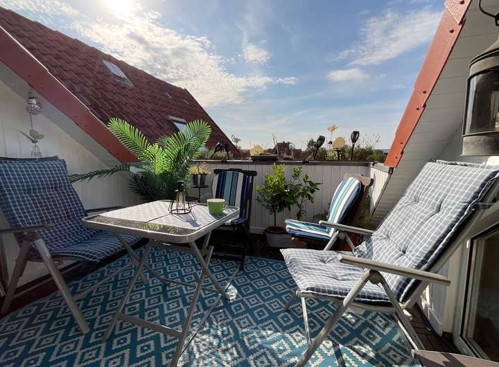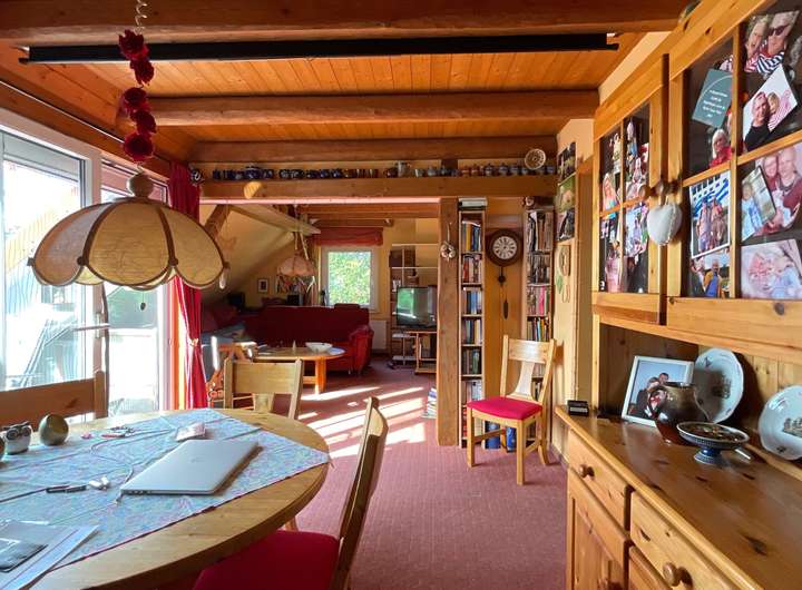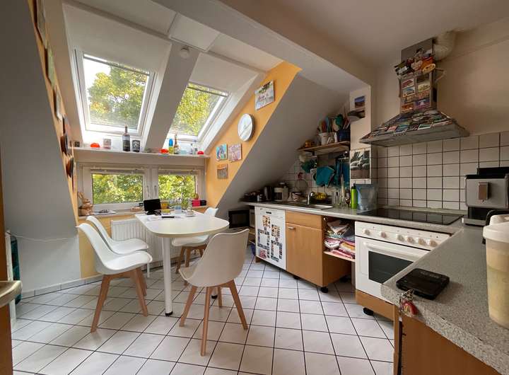 Im Dachgeschoß erwarten Sie 3 Zimmer, ein großer Abstell-/Arbeitsraum, Küche, Bad, Flur und eine wunderschön kuschelige Loggia, von der Sie einen herrlichen Blick über die Dächer von Lindhorst haben.