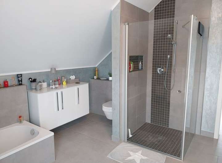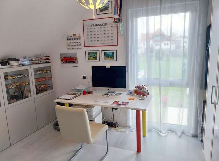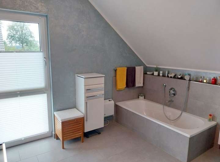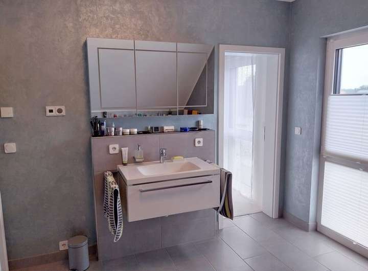 Im Obergeschoss befinden sich ein großes Schlafzimmer mit Ankleideraum und Zugang zum Bad mit Badewanne und eberdiger Dusche und ein Arbeits- oder Kinderzimmer.