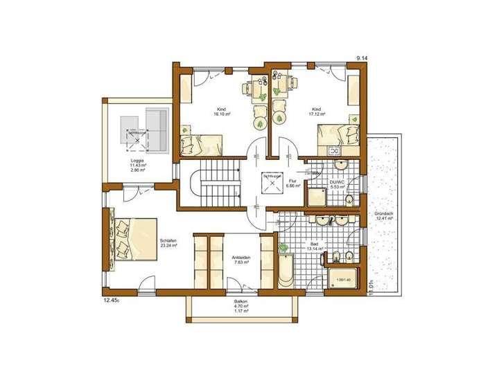 Eine Etage weiter oben ist neben den beiden Kinderzimmern mit eigenem Dusch-WC der überaus großzügige Rückzugsort für die Eltern untergebracht. Dieser auf Entspannung ausgerichtete Bereich erstreckt sich ebenfalls auf ca. 60 m² und umfasst ein Schlafzimmer mit Zugang zur überdachten Loggia, eine Ankleide mit vorgelagertem Balkon sowie einem eigenen Wellnessbad.