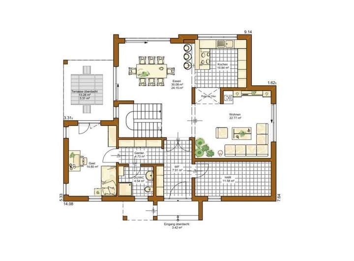(Windfang, Diele, Küche, Speisekammer, HWR, Bäder und WC)