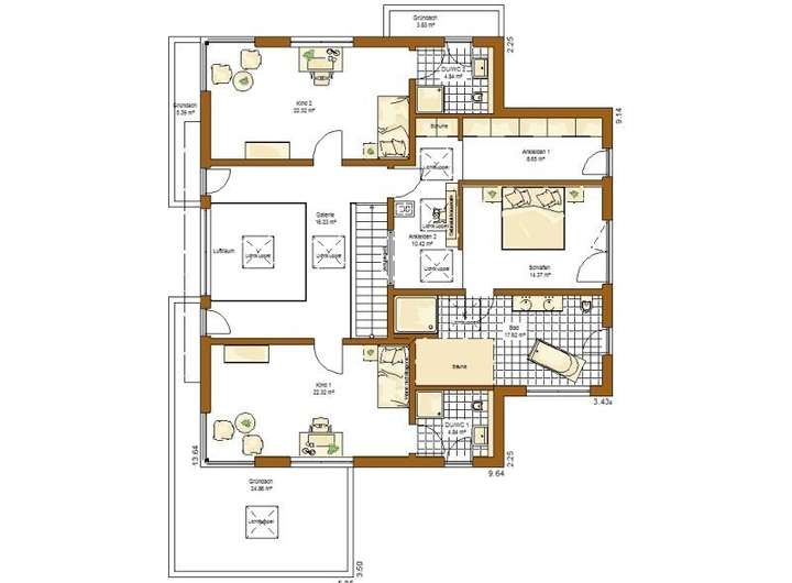 Die zentral angeordnete Galerie verbindet nicht nur die verschiedenen Bereiche, sondern lädt geradezu zum Verweilen ein. Die Verbindungsbrücke sowie der ausgelagerte Elternbereich schaffen genügend Abstand zwischen allen Bewohnern und ermöglichen dadurch maximalen und luxuriösen Freiraum zur persönlichen Entfaltung.