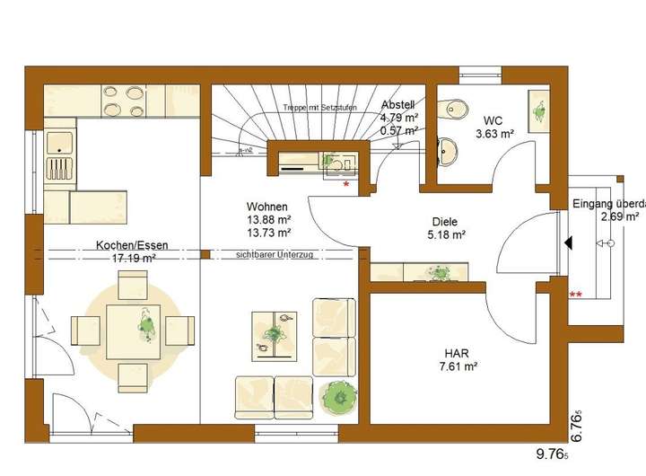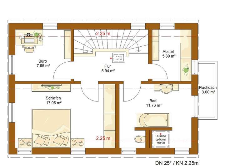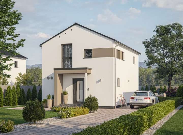 Dieses Einfamilienhaus (Clou 100) ist das Kompakt-Haus für Singles und Paare. Ein ansprechendes, pragmatisches und vollständiges Raumprogramm auf 100 m² Gesamtfläche, optimal für schmale Grundstücke. Kochen, Essen und Wohnen in einem clever konzipierten Raumkonzept. Das Innere wirkt hell und freundlich und konzentriert sich im Raumangebot auf das Wesentliche: Schönes Wohnen. Ein sinnvoller Abstellraum befindet sich gleich unter der Treppe. Ein modernes Bad und ein großzügiges Schlafzimmer befinden sich im Dachgeschoss.