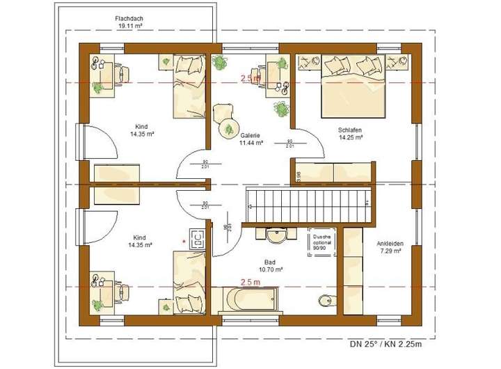 Dem Dachgeschoss mit zwei gleich großen Kinderzimmern, Familienbad sowie Elternschlafzimmer mit begehbarer Ankleide verleiht eine Galerie das besondere Etwas.