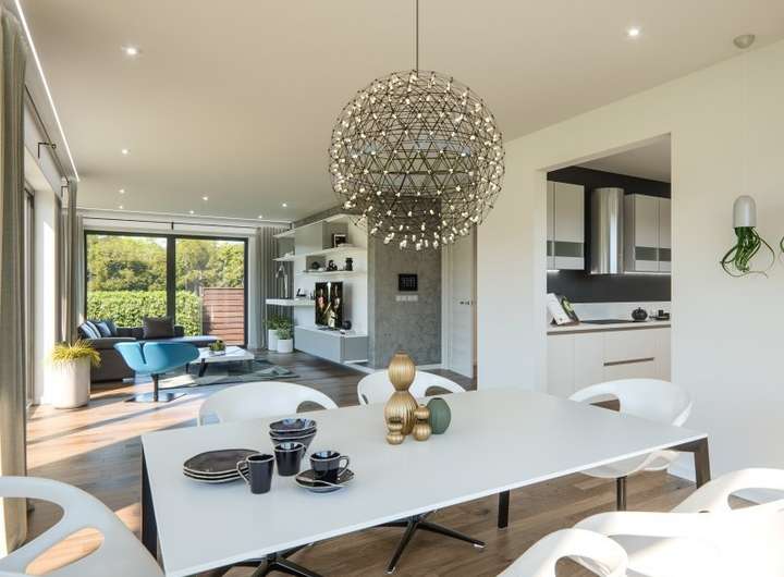 Beeindruckend ist die symmetrische Erweiterung des Wohn- und Essbereichs durch die Bauteiloption "Twincube", die den Raum auf über 45 Quadratmeter vergrößert und mit weiten Glasflächen viel Licht für den Wohnraum zulässt.