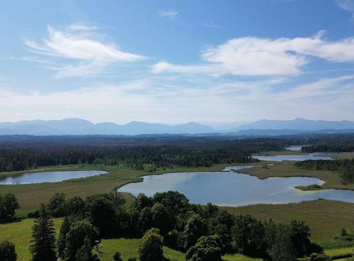 Ein echtes Highlight ist der unvergleichliche Ausblick: Vom Balkon aus eröffnet sich ein atemberaubendes Panorama über die malerischen Osterseen – so nah, als könnte man sie berühren. Dahinter erstrecken sich die majestätischen Bayerischen Alpen und in weiterer Ferne das Karwendelgebirge – ein Anblick, der seinesgleichen sucht.