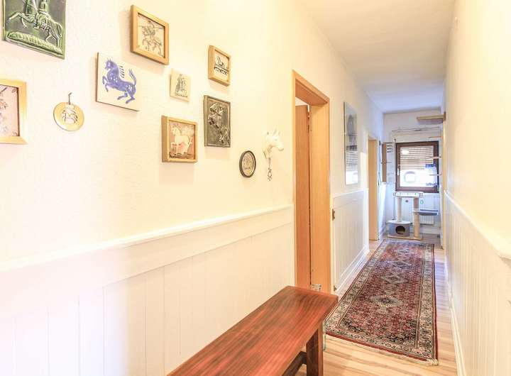 Der innenliegende Garten eröffnet Ihnen eine grüne Oase zum Entspannen. Hier findet sich auch eine kleine Koppel, die sich perfekt für eigene Shettys oder Kleintiere eignet. Über die geräumige Diele gelangen Sie in das Obergeschoss. Dort stehen Ihnen vier gemütliche Schlafzimmer, ein Büro sowie ein modernisiertes Badezimmer mit ebenerdiger Dusche zur Verfügung – ideal für Familien, Homeoffice oder Gäste. Das Haus ist teilunterkellert und bietet zusammen mit mehreren Nebengebäuden viel Stauraum sowie ideale Bedingungen für eine Werkstatt, Hobby- oder Heimwerkerbereich. Das Dachgeschoss bietet zusätzlichen Platz für weitere Ausbaumöglichkeiten.
