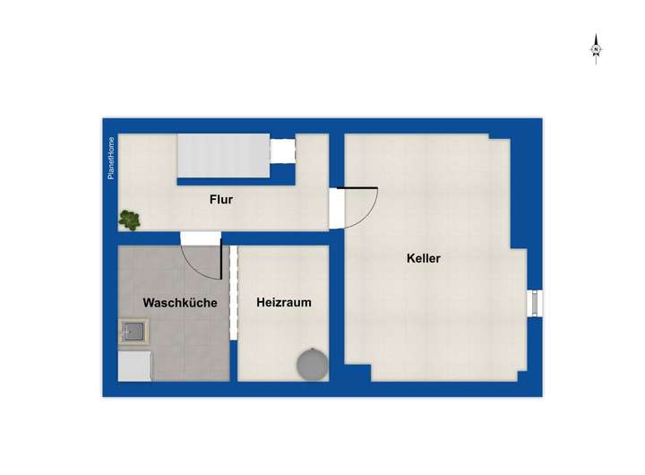 Der Keller ist vollständig gefliest und bietet mit einer Abstellkammer, dem Heizungsraum sowie einem Hauswirtschaftsraum (HWR) mit Anschlüssen für Waschmaschine und Trockner optimalen Nutzwert.