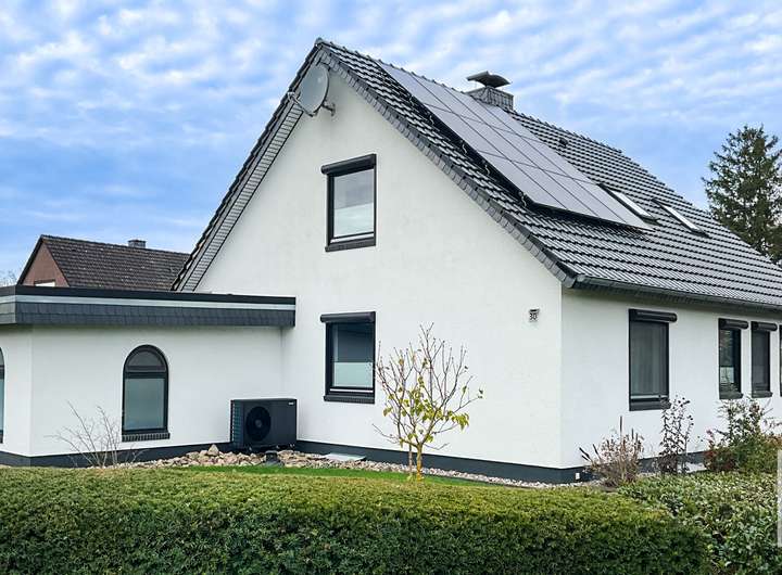 Das Haus ist mit moderner Technik ausgestattet: Wärmepumpe (2025), Photovoltaik sorgt für energieeffizientes Wohnen. Das große, uneinsehbare Grundstück bietet Terrasse, Schuppen und ausreichend Parkmöglichkeiten mit Garage und Wallbox.