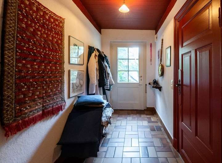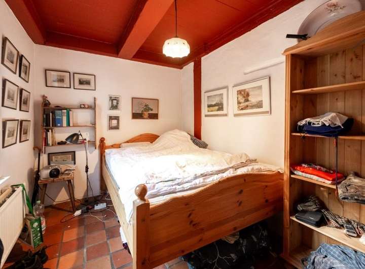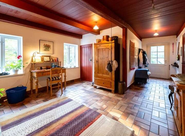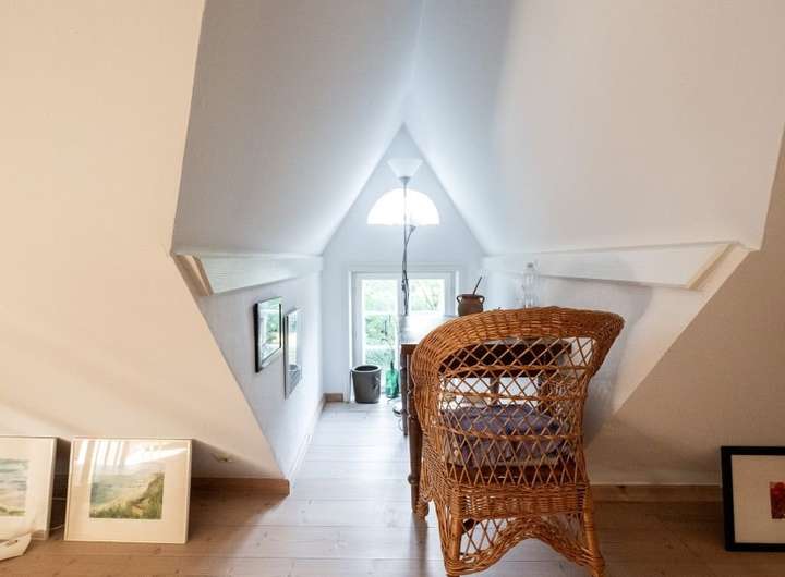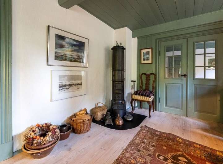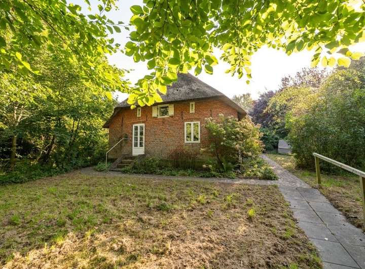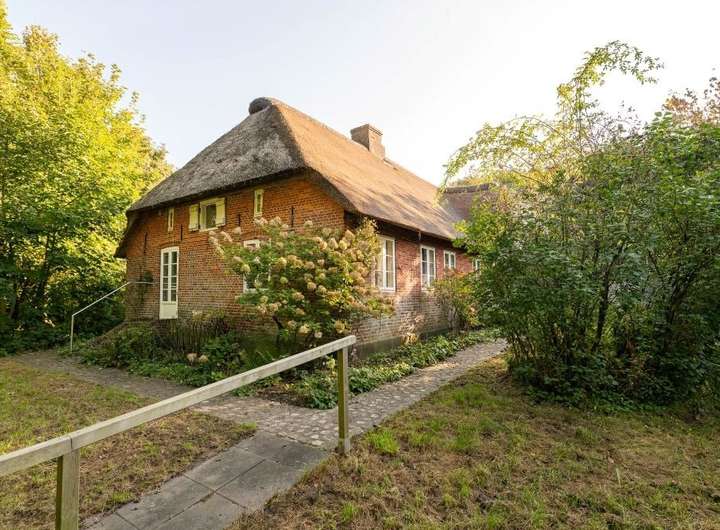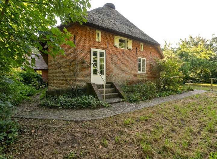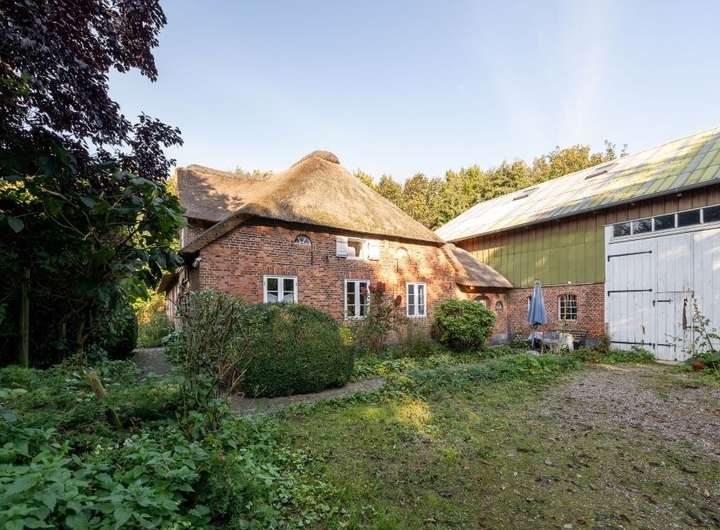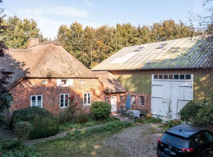 Im Innern des Hauses zeugen diverse Einbauten und Details von einer bewegten Vergangenheit. Im Norden steht parallel dazu die Stallscheune, die über einen reetgedeckten Verbindungsbau an das Bauernhaus angeschlossen ist.