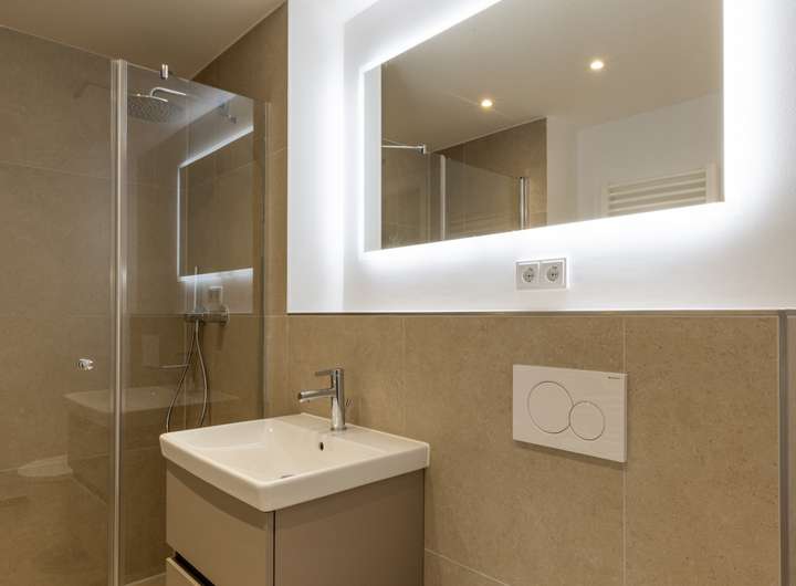 - moderner Waschtischunterschrank mit Auszügen und beleuchtete Spiegel mit Spiegelheizung in im Bad und Gäste WC