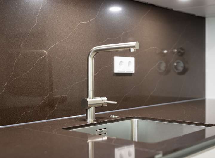 - Re-Stoning Arbeitsplatte und Nischenrückwand in "marrone vene" (dunkel)