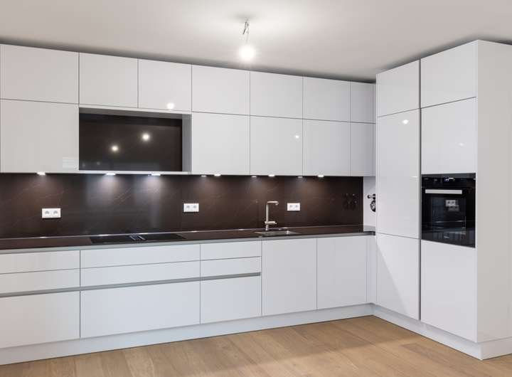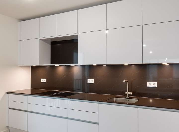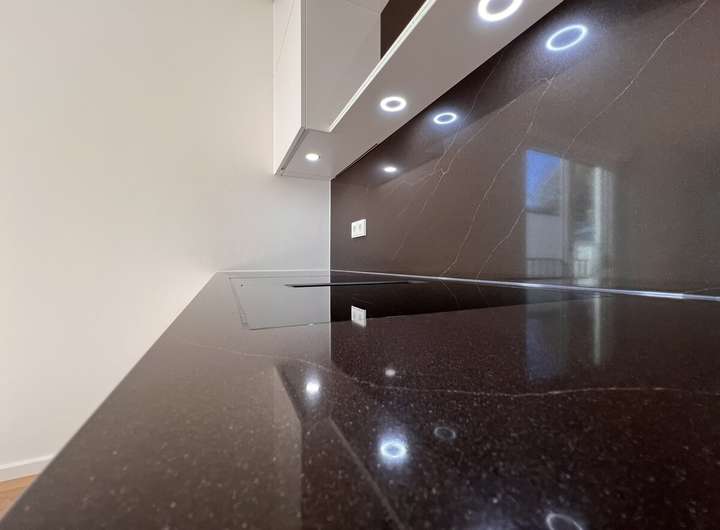 - Re-Stoning Arbeitsplatte und Nischenrückwand in "marrone vene" (dunkel)