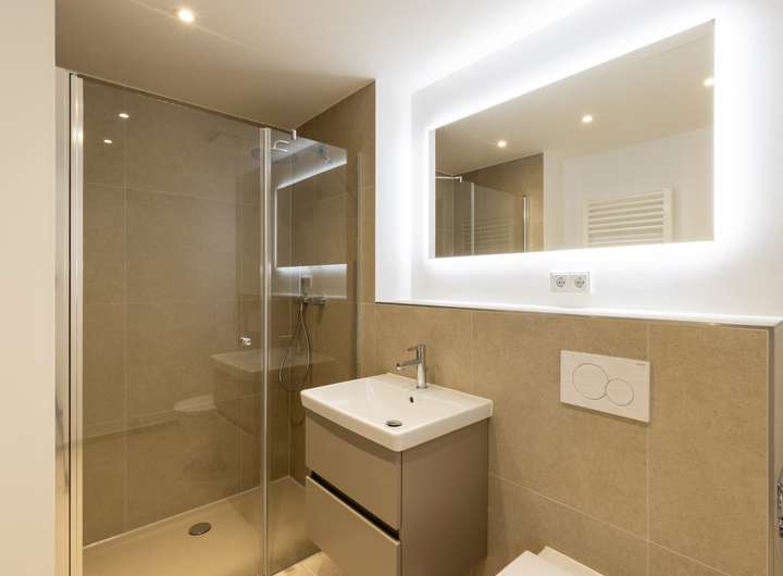 - im Bad und Duschbad großformatiges Feinsteinzeug (60cm x 60 cm) verlegt