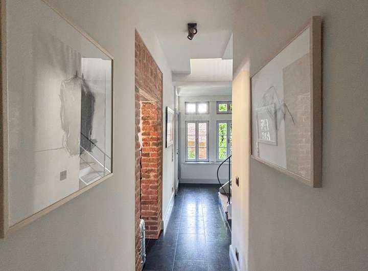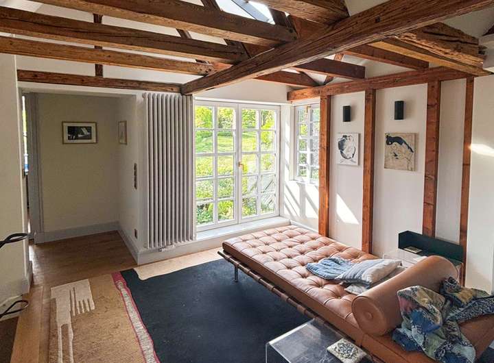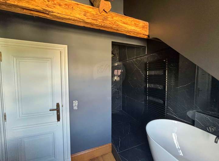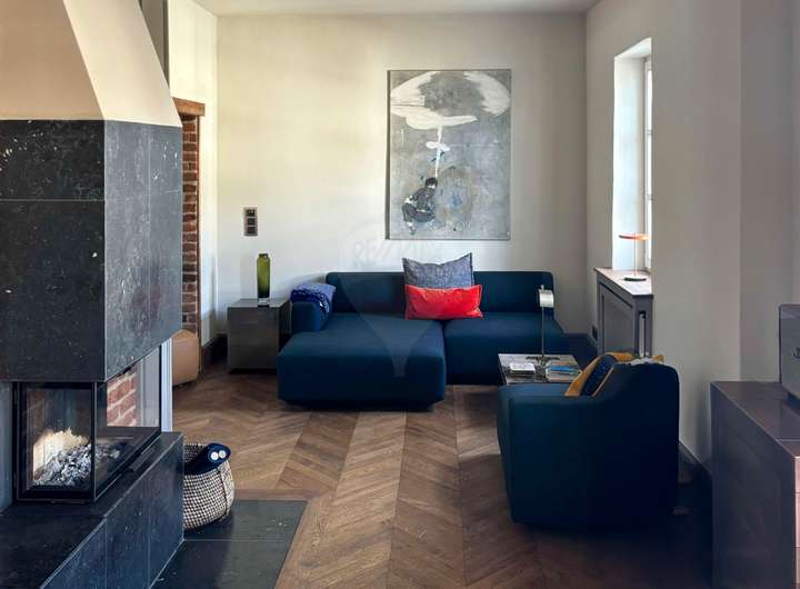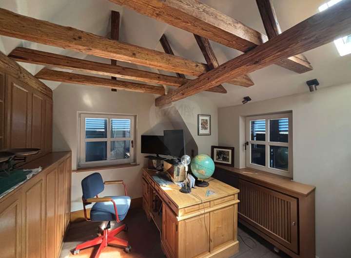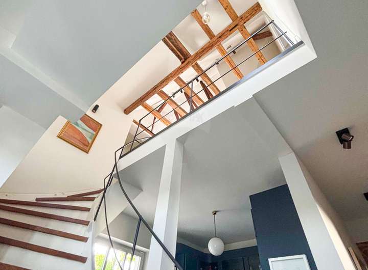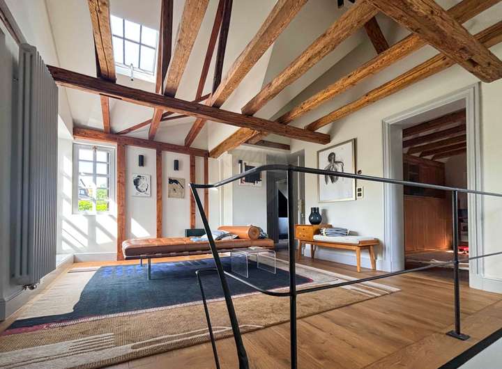 Im Inneren erwartet Sie eine gekonnte Symbiose aus Tradition und Moderne: freigelegte historische Balken, Sprossenfenster und ein Holzkamin schaffen Behaglichkeit, während hochwertige Materialien wie Eichenparkett und Kalksteinböden für zeitlose Eleganz sorgen. Die offene Galerie im Obergeschoss und die durchdachte Architektur schenken dem Haus Großzügigkeit und viel Licht.
