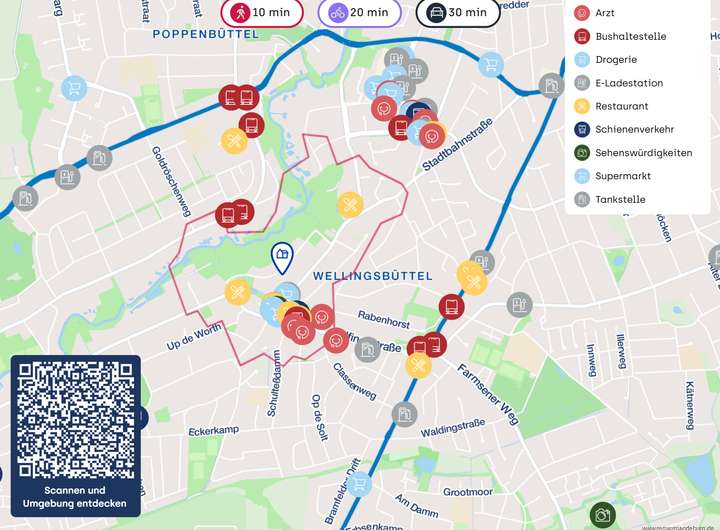 Trotz der ruhigen, grünen Umgebung genießen Bewohner eine hervorragende Anbindung und Infrastruktur. Die S-Bahn-Station Wellingsbüttel ist fußläufig erreichbar und ermöglicht eine komfortable Verbindung in die Hamburger Innenstadt. Einkaufsmöglichkeiten, charmante Boutiquen, Kindergärten – darunter eine Einrichtung direkt in der Straße – sowie renommierte Schulen und vielfältige Sport- und Freizeitangebote liegen in unmittelbarer Nähe.