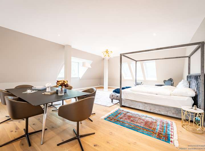 Das Dachgeschoss bildet den krönenden Abschluss: Eine weitläufige Galerie, ein großzügiger Wohn- und Schlafbereich, ein stilvoller Ankleideraum sowie ein modernes Tageslichtbad schaffen einen idealen Rückzugsort. Perfekt geeignet als private Suite, Gästebereich oder Atelier.