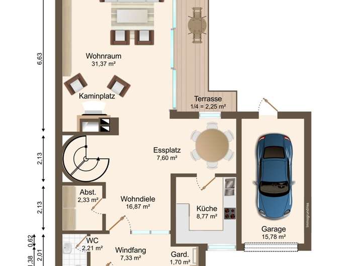 Der Hauseingangsbereich verfügt über einen Windfang mit Garderobenecke sowie einem Gäste-WC.
