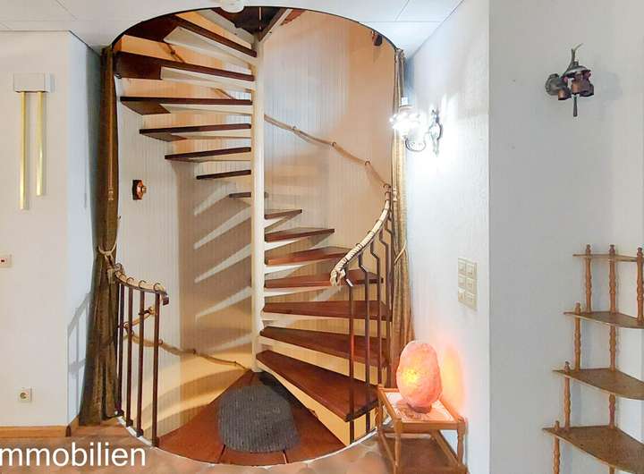 Im Inneren des Hauses erwartet Sie eine formschöne Wendeltreppe aus Holz, welche alle Ebenen miteinander verbindet.