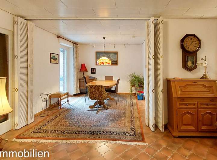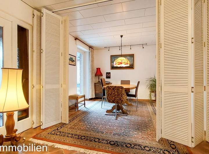 Ein großer Wohnbereich mit bodentiefer Fensterfront, sowie der durch eine Flügeltür getrennte offene Essbereich mit angrenzender Küche, charakterisieren die Bauzeit des Hauses und tragen somit zu einer charmanten Wohnatmosphäre bei.