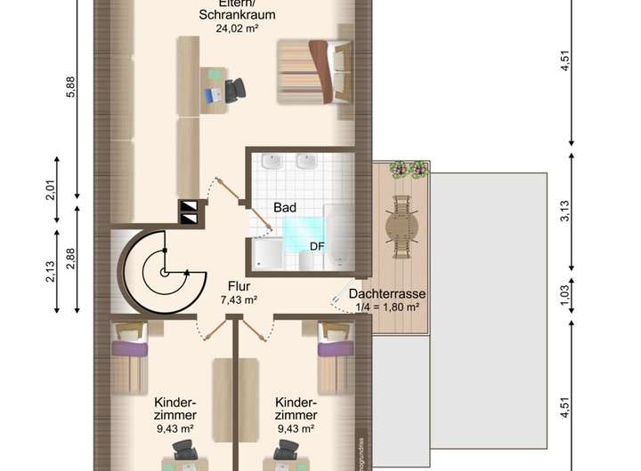 Das Obergeschoss verfügt über drei Räumlichkeiten und bietet Ihnen eine bis in den Giebel ausgebaute Deckenhöhe. Ein geräumiges Tageslichtbad sowie der Zugang vom Flur auf die Dachterrasse komplettieren diese Ebene.