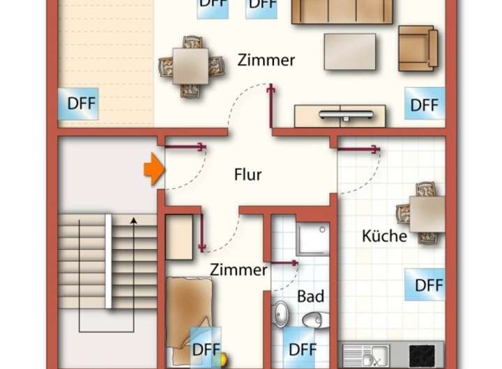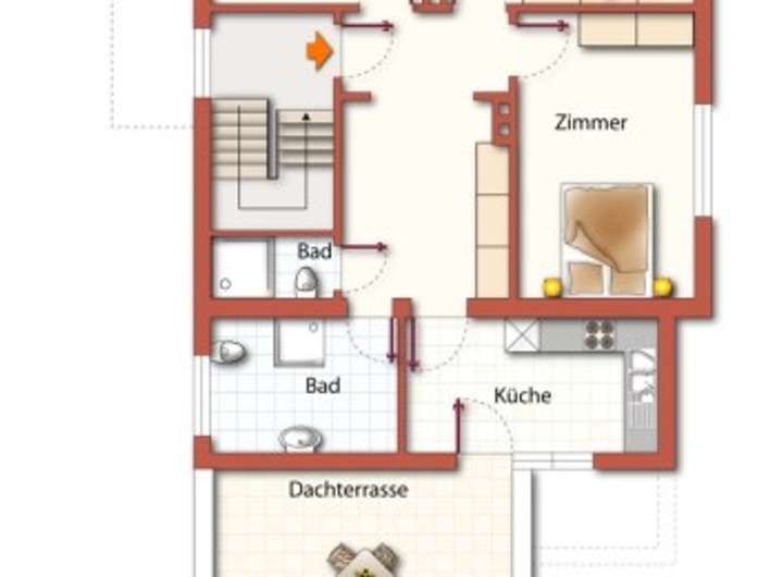 Im Obergeschoss befindet sich eine 73m² große 3-Zimmer-Wohnung mit Diele, Einbauküche, Badezimmer und Gäste-WC. Von der Küche hat man über ein bodentiefes Fensterelement Zugang auf die nach Südwesten ausgerichtete Dachterrasse.