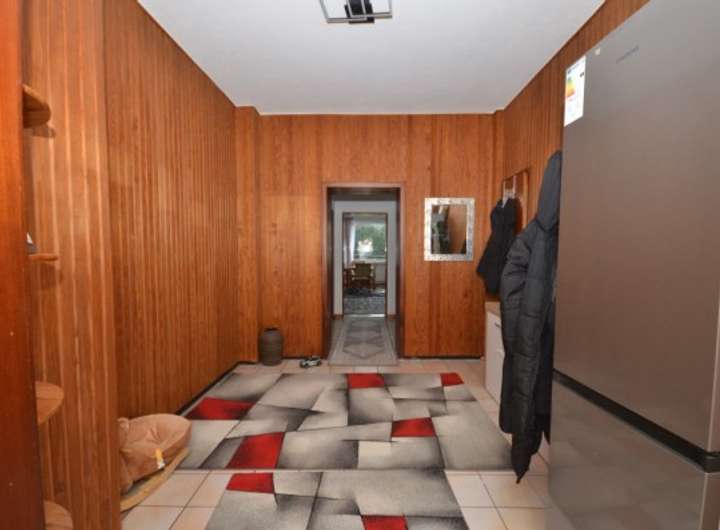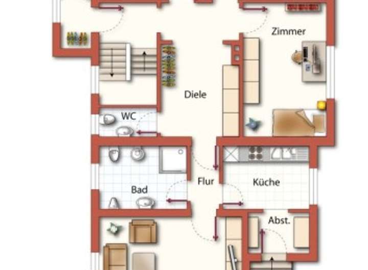 Über ein Drei-Stufen-Podest gelangt man zunächst in einen Windfang und von dort in das Treppenhaus. Die 114m² große Wohnung im Erdgeschoss verfügt über vier Zimmer, eine großzügige Diele, ein Badezimmer mit Dusche, WC, Bidet, Urinal und Waschbecken, ein Gäste-WC sowie eine Einbauküche mit angrenzendem Abstellraum mit Außenzugang.