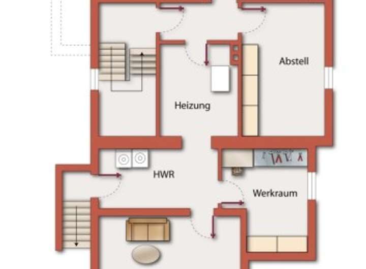 Im Kellergeschoss sind der Heizungsraum, ein Hauswirtschaftsraum mit Außenzugang, zwei Abstellräume sowie ein beheizbarer Hobbyraum vorhanden.