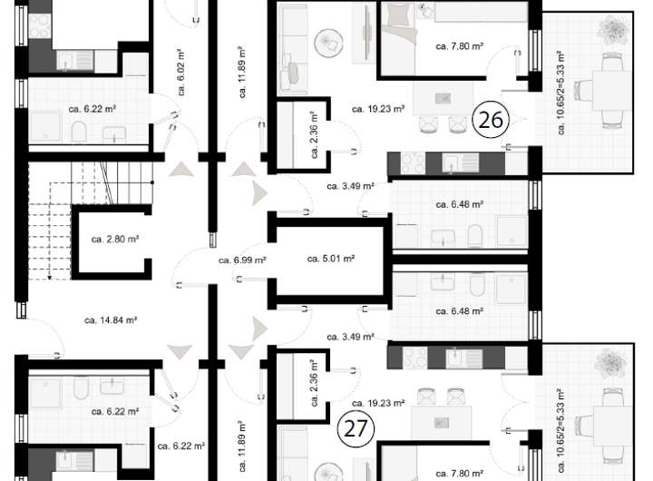 Angeboten werden hier zwei baugleiche (Nummer 24 & 29), barrierefreie 2-Zimmer-Wohnungen im Erdgeschoss. Jede Wohnung verfügt über einen hellen Wohn- und Essbereich mit offener Küche und Zugang zu einer großzügigen Terrasse, ein gemütliches Schlafzimmer, ein modernes Tageslichtbad mit bodenebener Dusche und Waschmaschinenanschluss sowie einen praktischen Abstellraum. In die Wohnfläche sind 5,1 m² anteilig aus den gemeinschaftlich nutzbaren Flächen eingerechnet. Diese bieten zahlreiche Möglichkeiten für Begegnung und Aktivität. Ein großer Aufenthaltsraum (65m²) mit Teeküche und Außenterrasse lädt zum geselligen Beisammensein oder zum Empfang von Besuch ein. Für Bewegung steht ein Sportraum zur Verfügung, zusätzlich gibt es einen Raum für Physiotherapie oder diverse Pflegeanwendungen.