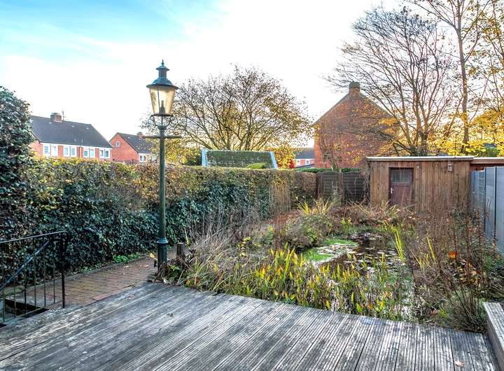 Garten: Terrasse in westlicher Ausrichtung mit Markise, ein Gartenteich sowie ein Holzhaus