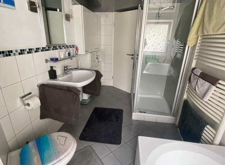 Die Ausstattung lässt keine Wünsche offen: Mehrere Kellerräume bieten ausreichend Stauraum. Die effiziente Gas-Zentralheizung wird durch einen Pelletofen im Erdgeschoss ergänzt, der dank der offenen Bauweise einen Großteil des Hauses mit wohliger Wärme versorgt und den Gasverbrauch deutlich reduziert. An heißen Sommertagen sorgt eine Klimaanlage im Dachgeschoss für angenehme Temperaturen.