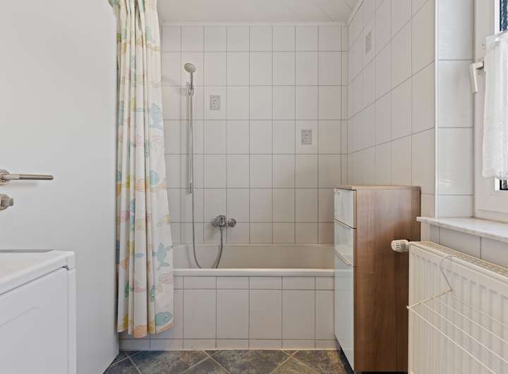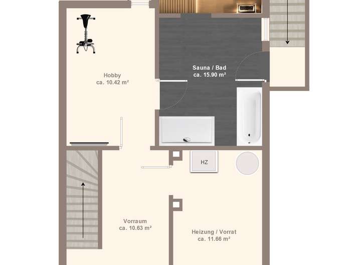 Im Keller gibt es einen Hobbyraum und einen Raum mit Sauna und Dusche/Wanne.