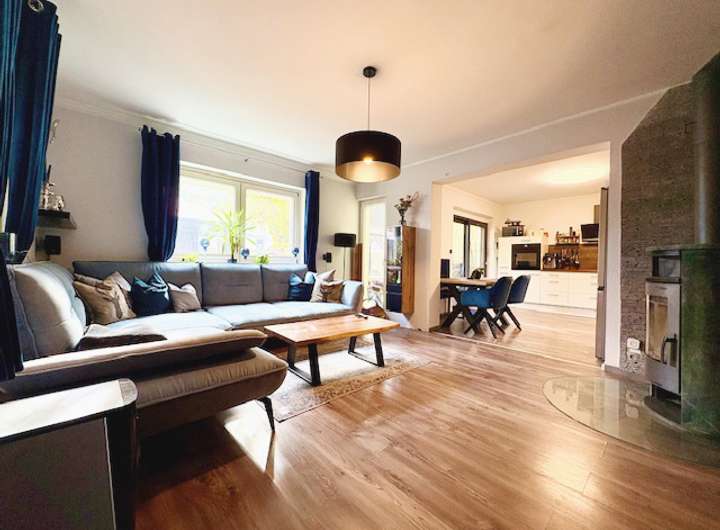 Der großzügige Wohn- und Essbereich vermittelt eine einladende Atmosphäre für die ganze Familie. Der offene Schnitt inklusive gemütlichem Holzkaminofen öffnet sich zur überdachten Terrasse und zum liebevoll gepflegten Garten mit Whirlpool und Gartenhaus.