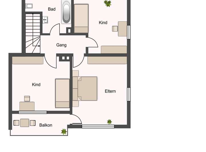 Im Obergeschoss befinden sich ein Tageslicht-Bad mit Dusche und Badewanne sowie drei Schlafzimmer. Ein Schlafzimmer verfügt über Zugang zum Südbalkon.