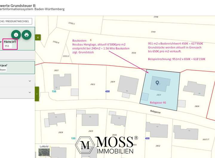 Ein vergleichbarer Neubau an dieser Lage würde allein für die Baukosten an dieser Hanglage (6'500€ pro m2) etwa 1.5 Mio an Kosten verursachen, da das Bauen am Hang bedingt durch eine deutlich aufwendigeres Fundament immer deutlich teurer ist. Zusammen mit dem Grundstück käme man auf rund 2 Mio Gesamtkosten, weshalb dieses Haus eine interessante Alternative bietet, zumal die Bausubstanz und der Unterhaltszustand ausgezeichnet sind und selbst mit einer Komplettsanierung in etwa +/- 1 Mio Gesamtkosten zu erwarten sind, je nach Ausstattungswünschen.