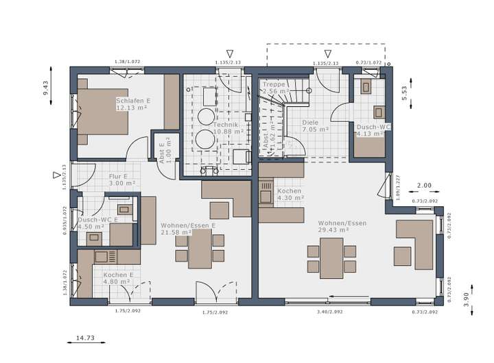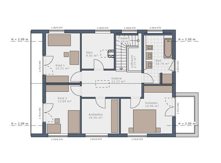 Das großzügige Einfamilienhaus besticht durch die modernen, großflächigen Fenster, die viel Licht ins Innere lassen und zum Verweilen mit Familie und Freunden einladen. Wohnen, Essen und Kochen bilden im Erdgeschoss eine Einheit und bieten über die Terrasse direkten Zugang in den Garten, sodass Sie Ihre Kinder stets im Blick haben. Im Erdgeschoss befinden sich außerdem ein Technikraum sowie ein Gäste-WC. Im Dachgeschoss gibt es keinen Streit um die Auswahl der Zimmer, denn diese sind nahezu gleich groß und im großzügigen Wellness-Bad gibt es am Morgen auch kein Gedränge.