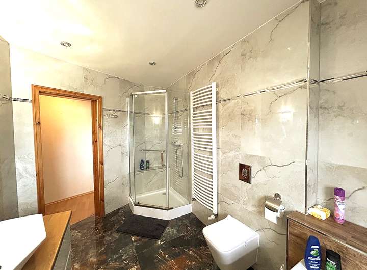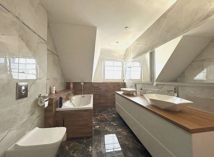 Diese Immobilie beeindruckt durch ihre durchdachte Ausstattung und hochwertige Details. Das Badezimmer, das mit modernen Armaturen und stilvollem Design gestaltet wurde, verfügt über ein großzügiges Vollbad und eine separate Dusche, die höchsten Komfort und Funktionalität bieten. Eine geschmackvolle Fliesenauswahl und geflieste Wände runden das luxuriöse Ambiente ab.