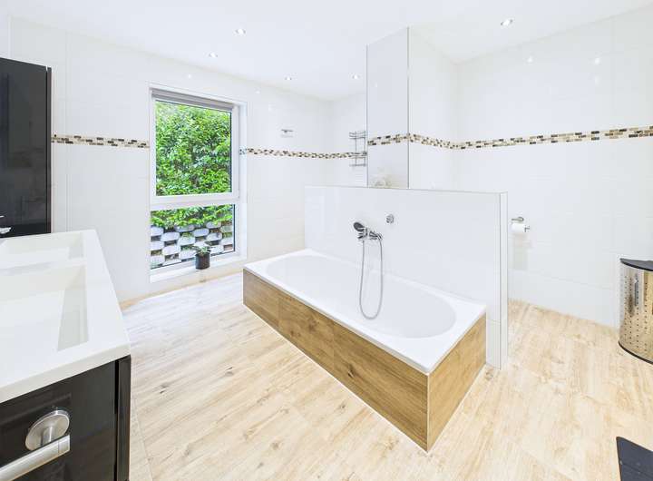 Das Obergeschoss beherbergt drei optimal geschnittene Schlafzimmer sowie ein lichtdurchflutetes Badezimmer mit Doppelwaschbecken, Walk-In-Dusche und Badewanne.