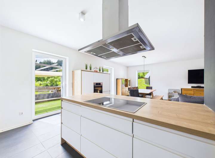 Die überdachte Südterrasse lädt zu entspannten Mahlzeiten, sonnigen Nachmittagen oder geselligen Abenden ein. Eine Garage sowie zwei Außenstellplätze sorgen für komfortables Parken.