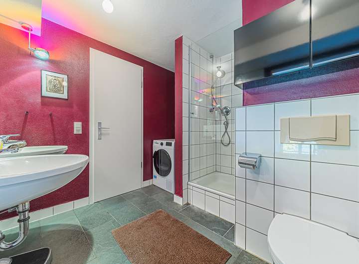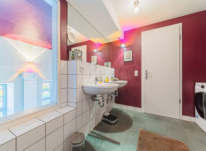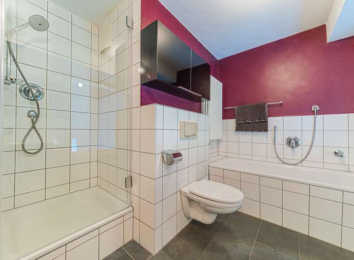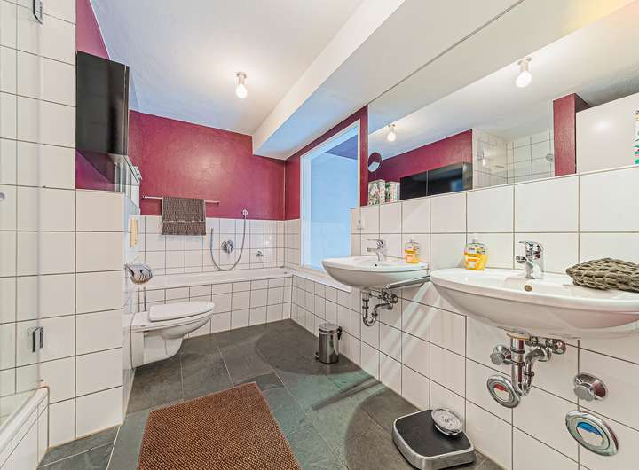Großes Tageslichtbad mit Dusche und Badewanne - gute Badausstattung, Echtglasabtrennung, Doppelwaschbecken, Toilette