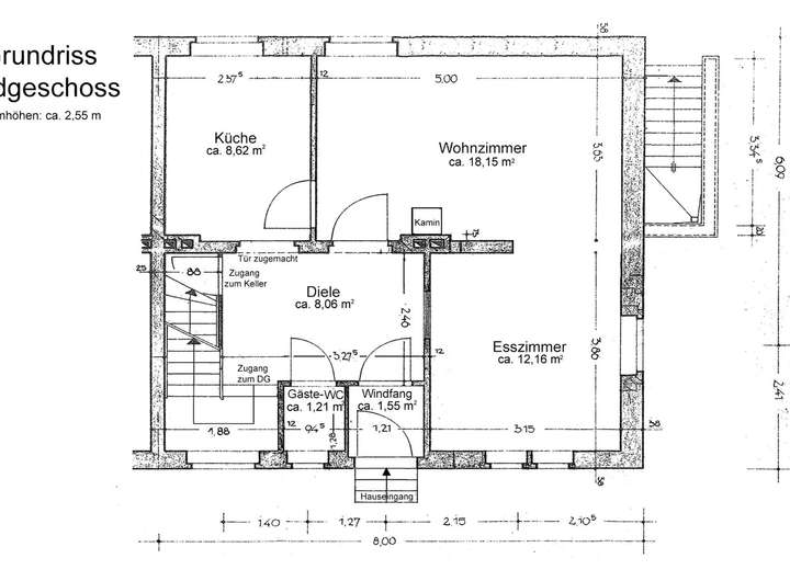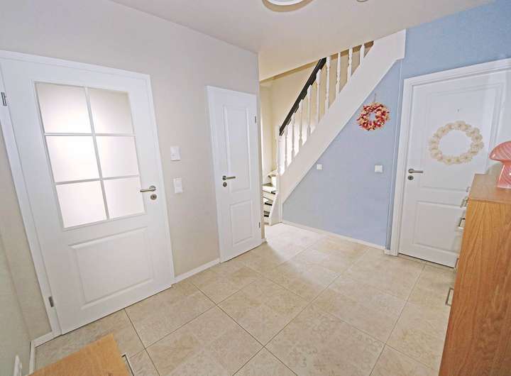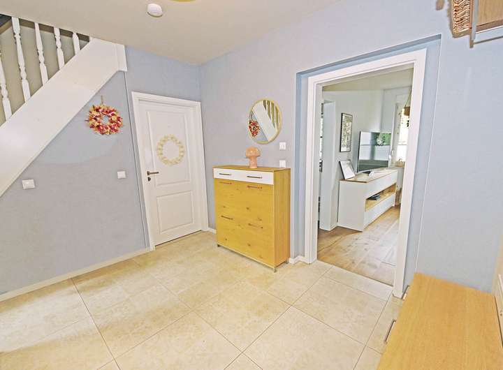 großes Wohnzimmer mit Kamin und Essbereich, Küche, Gäste-WC, Diele, Windfang